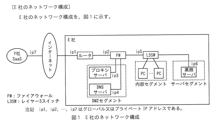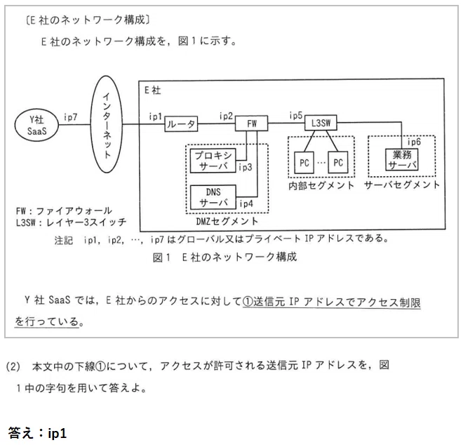 ネットワーク構成図やFWルール、DNSレコードといった図表から情報を読み取り、答える問題です。