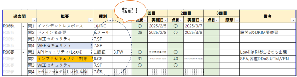 重点対策本の各章の冒頭「2.学習方法」にある表で、試験区分が「SC」の問題を学習履歴表に書き移していくだけです。